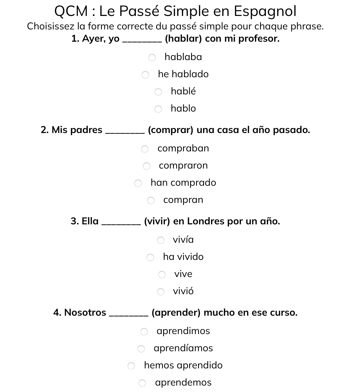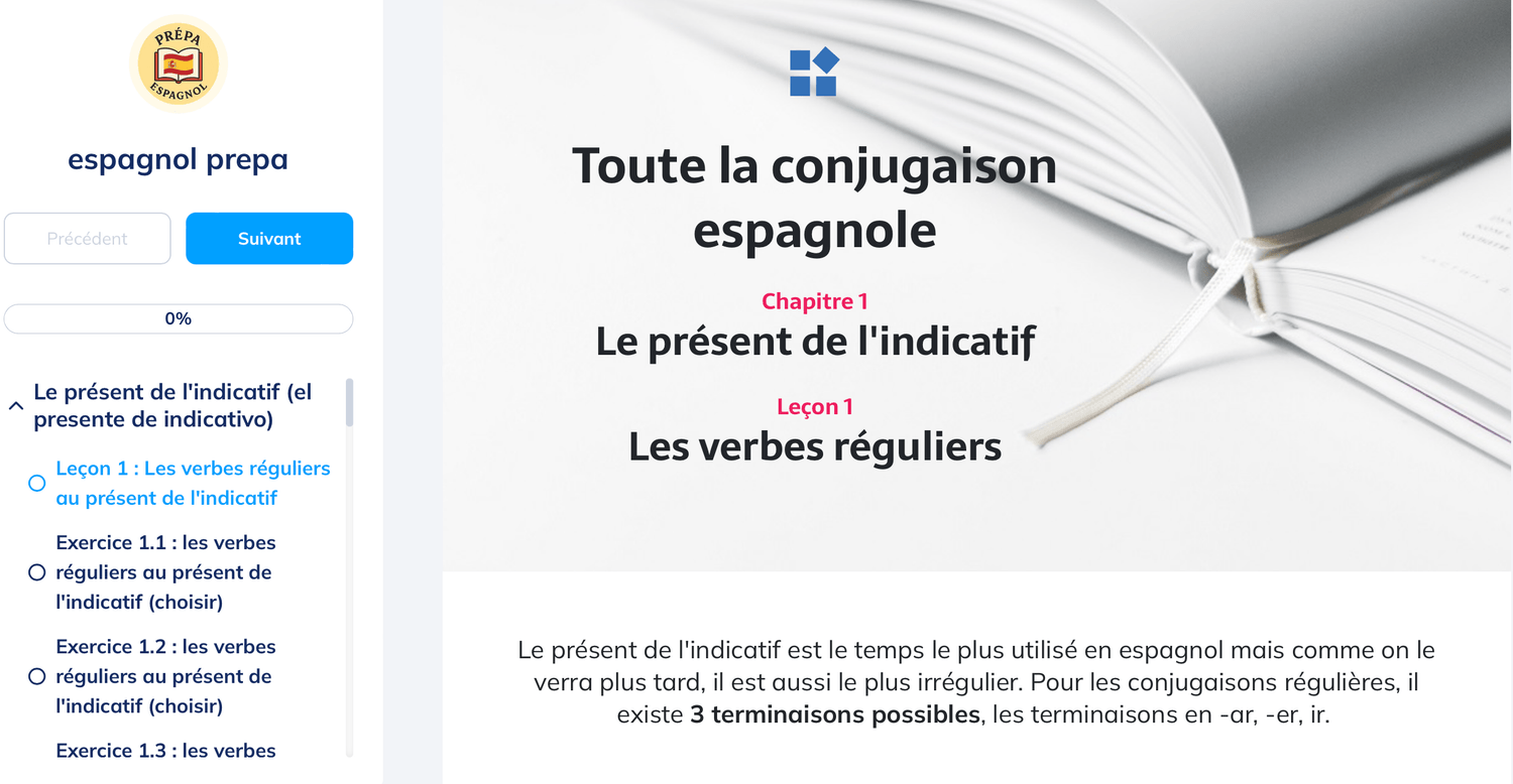 Nous vous proposons un programme systématique, complet et intensif qui couvre chaque temps et chaque mode de la conjugaison espagnole. Conçu par un enseignant CPGE, il est parfaitement adapté aux exigences académiques de l'enseignement supérieur.